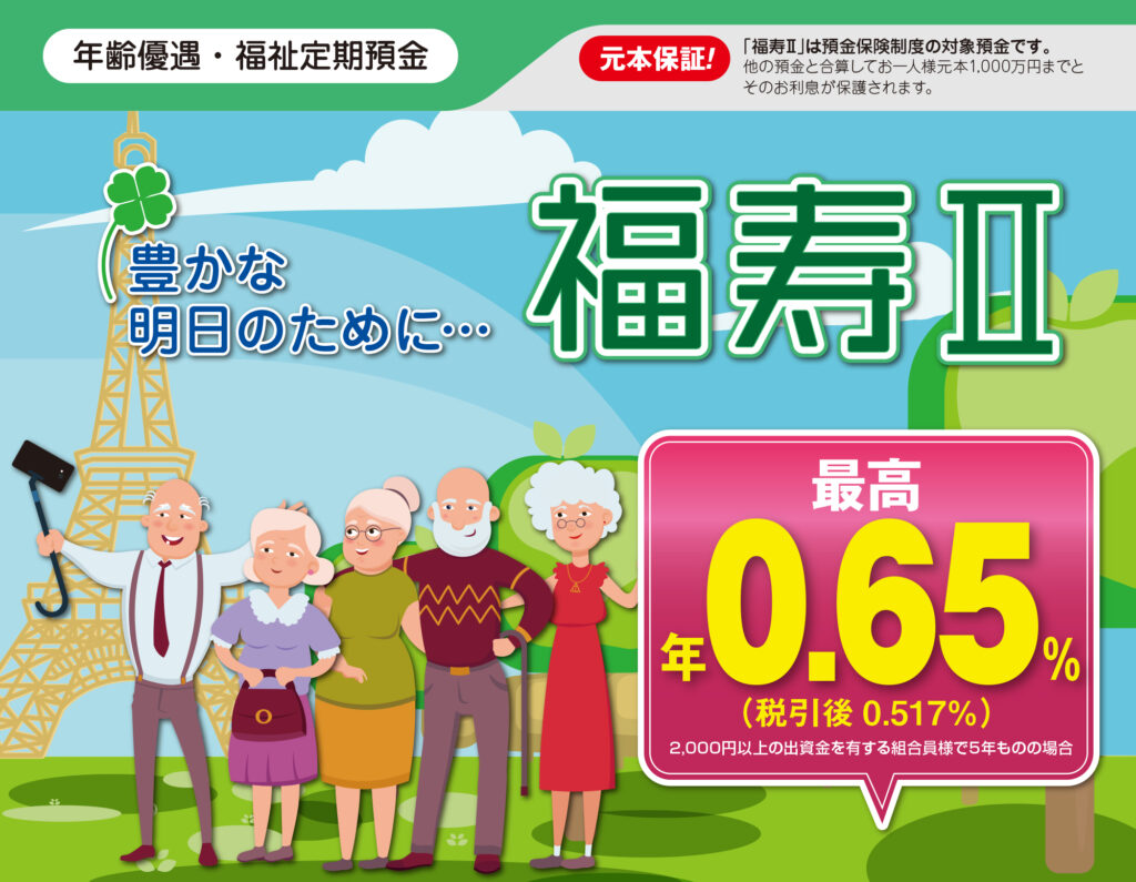 | 組合員金利 | 1年0.45%(税引後0.358%) | 3年0.55%(税引後0.438%) | 5年0.65%(税引後0.517%) |