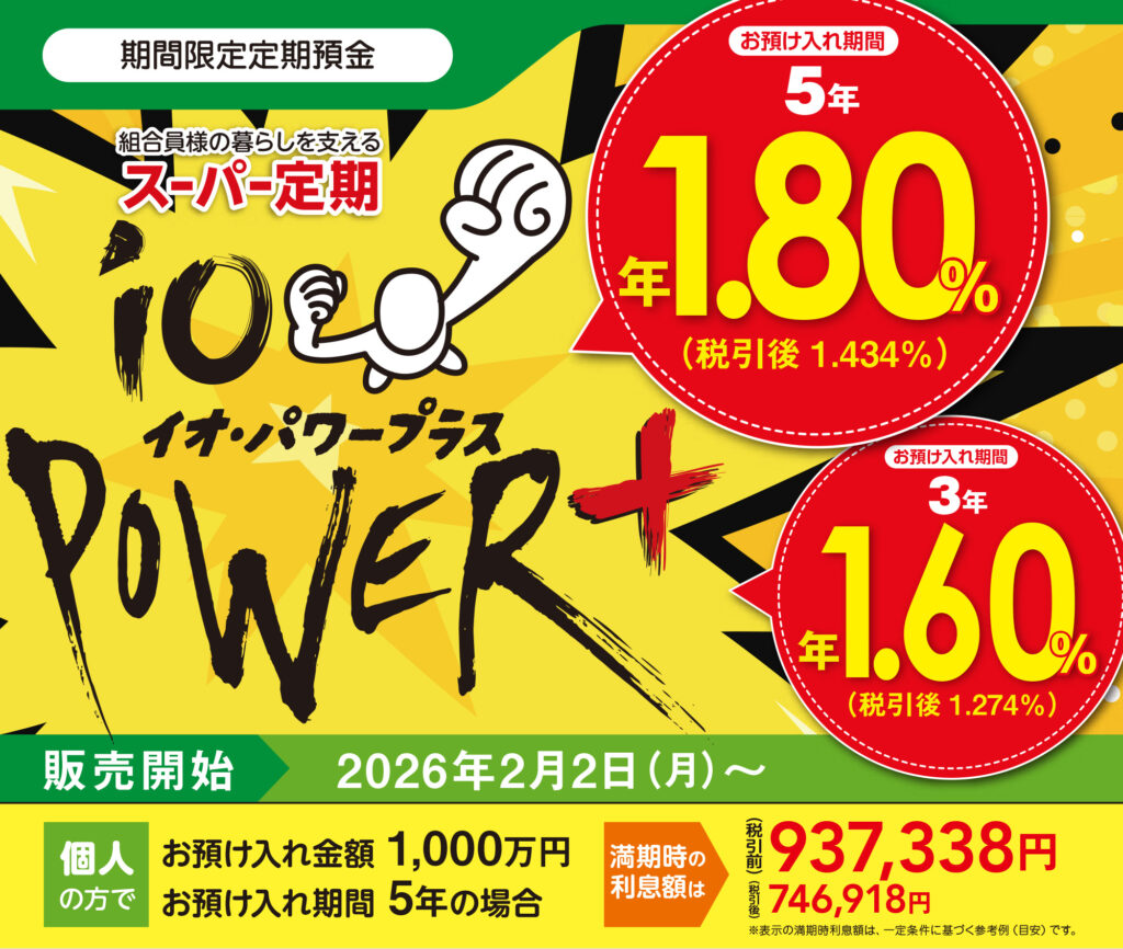 | 預入条件 | ①新規預入 ②「イオ・パワー」、「イオ・パワーⅡ」の満期を迎える方は「イオ・パワープラス」での継続(同額、増額のみ)が可能です。 但し、預け替えの手続きが必要となります。 |